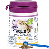 La poudre naturelle orale Plaque Off de ProDen à mélanger au croquettes permet de prévenir une gingivite, le tartre, la plaque dentaire et d’aider à éliminer la mauvaise haleine chez le chat.