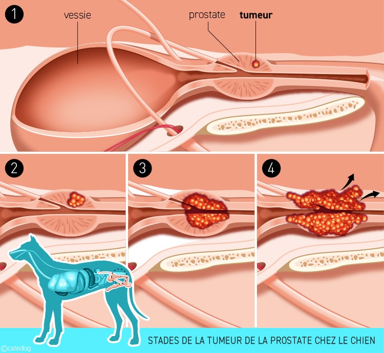 Il s’agit surtout de tumeurs malignes. Ce sont des tumeurs graves encore appelées cancer ou tumeurs cancéreuses. Elles se propagent à d’autres parties du corps (on parle alors de métastases) et peuvent engager le pronostic vital du chien. Les tumeurs de la prostate métastasent vers les ganglions, les régions voisines, puis en dernier lieu vers les poumons.